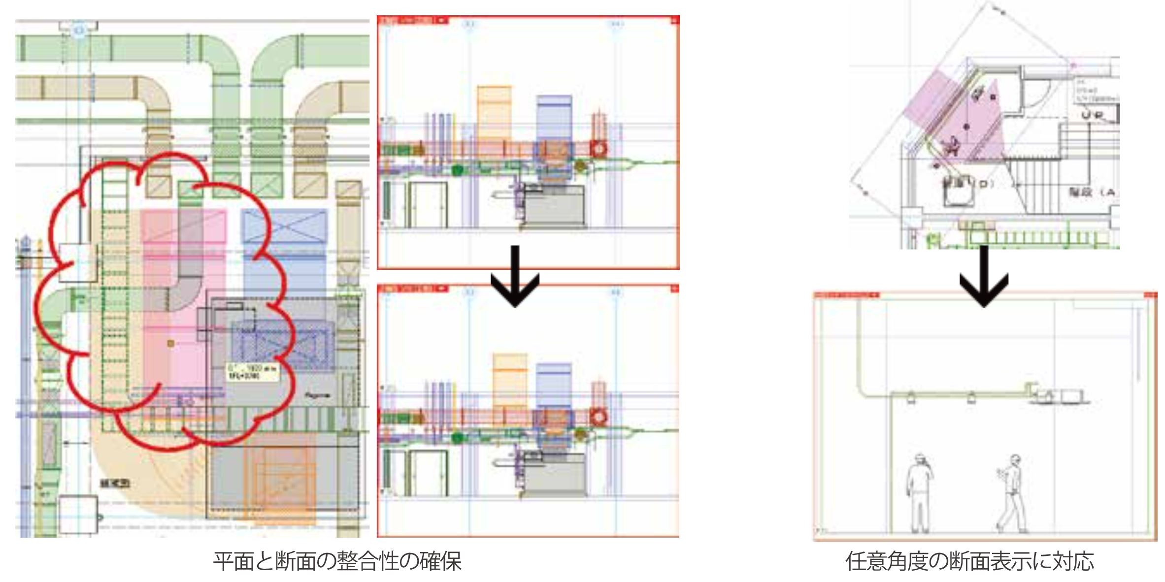 また、単一のモデルデータから平面図や断面図、詳細図など各種図面を生成し、相互に連動して修正内容を反映します。これにより、設計から施工、維持管理までの情報をシームレスに展開し、設備業務の効率化と改善に貢献します。