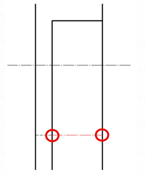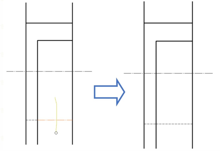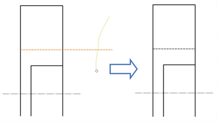 ※コマンドモード3(未公差要素の編集)「する」に変更した理由は、下記図面のように変更したい要素が両端点となり、交点が無い場合に利用します。「なし」の場合は、自動で近い交点から属性変更を行いますが、両方が端点のみ場合は対象になりません、このような要素を削除・属性変更対象とするため「する」を選択しています。