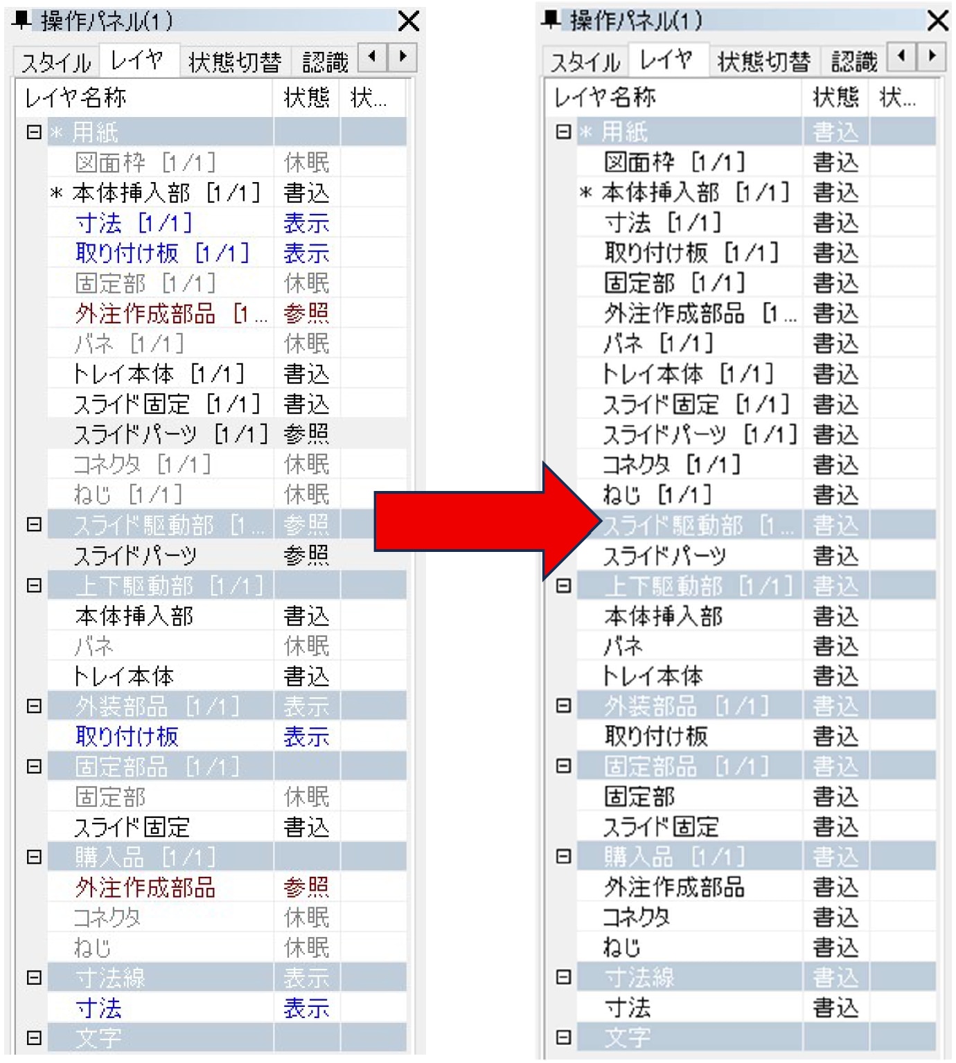 【設定編】レイヤをすべて書込み化したいABKSSブログ編集部CADSUPER_tipsCADSUPER設定編レイヤ状態を休眠や表示等、レイヤ毎設定する事が可能ですが、ワンコマンドで全てを書込みに変更可能です。 操作方法[表示]-[レイヤ]-[全レイヤ書込み化] を選択します。 CADSUPER|ICT&CAD/CAM/CAE/BIMハイパフォーマンスな性能を持つ2次元CAD「CADSUPER」は、純国産の強みを活かし、日本人が簡単・便利に設計できるような機能が充実しています。株式会社エービーケーエスエスABKSSブログ編集部ABKSSブログ編集部は、製造業・建設業に特化した情報を発信するメディアチームです。CADや設計に関する実務的なノウハウから、AIの活用、BIM・CIM、DX推進といった最新技術の動向まで、業界の課題解決に役立つ情報をわかりやすくお届けしています。