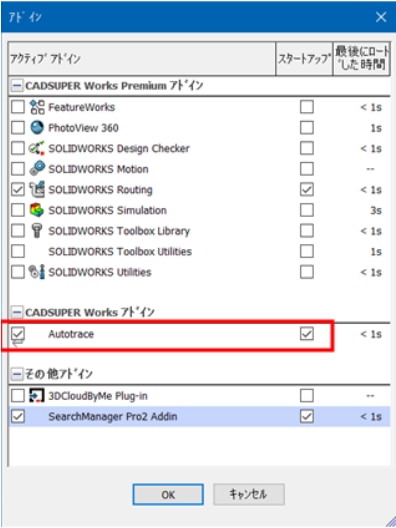 - [ツール]-[アドイン]を選択します。「Autotrace」にチェックオンで機能を有効にします。