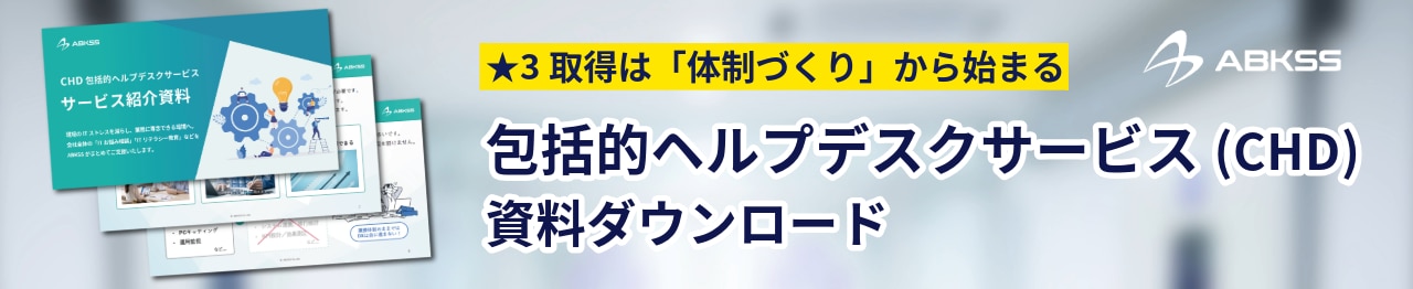 ABKSSの包括的ヘルプデスクサービス(CHD)は、ITの相談窓口を一本化し、ITストレスのない「業務に専念できる環境づくり」を包括的に支援するサービスです。日々の問い合わせ対応から運用の見直し、社内教育まで、必要な運用業務を一体でサポートします。