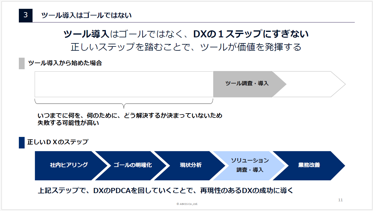 原因を解決するために、当社で提供しているサービスがどのようなものか、スケジュールや支援方法を含め説明しています。これからDXに取り組む方や、すでに進めているものの壁に直面している方におすすめです。