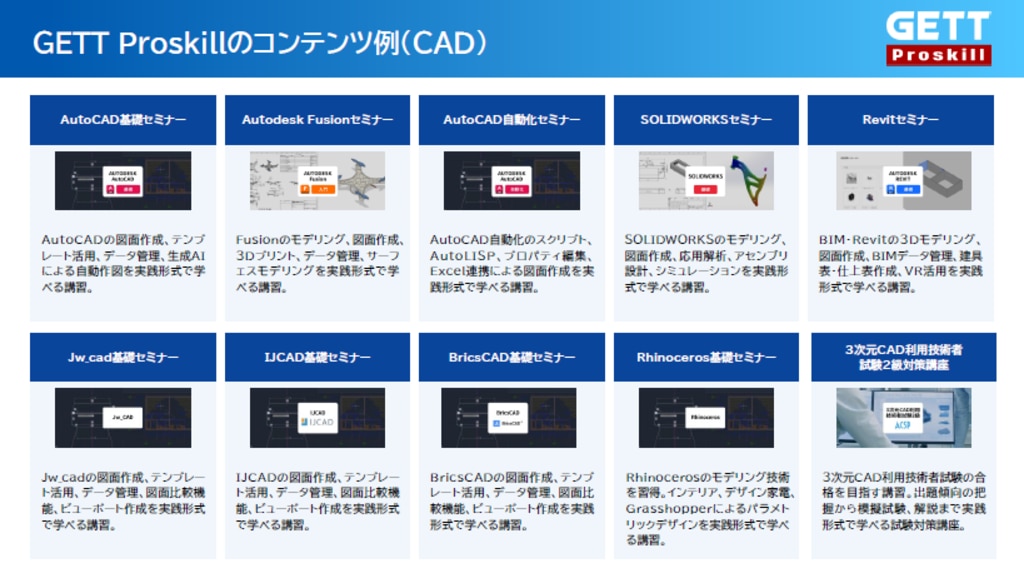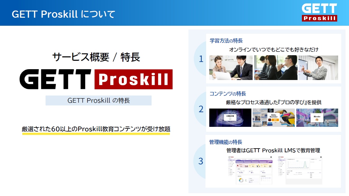 GETT Proskill の紹介資料です。IT基礎・Office・セキュリティから、DX・CAD・AIなどの専門領域まで。貴社の課題と対象者に合わせて、必要な学習領域と進め方をご提案します。