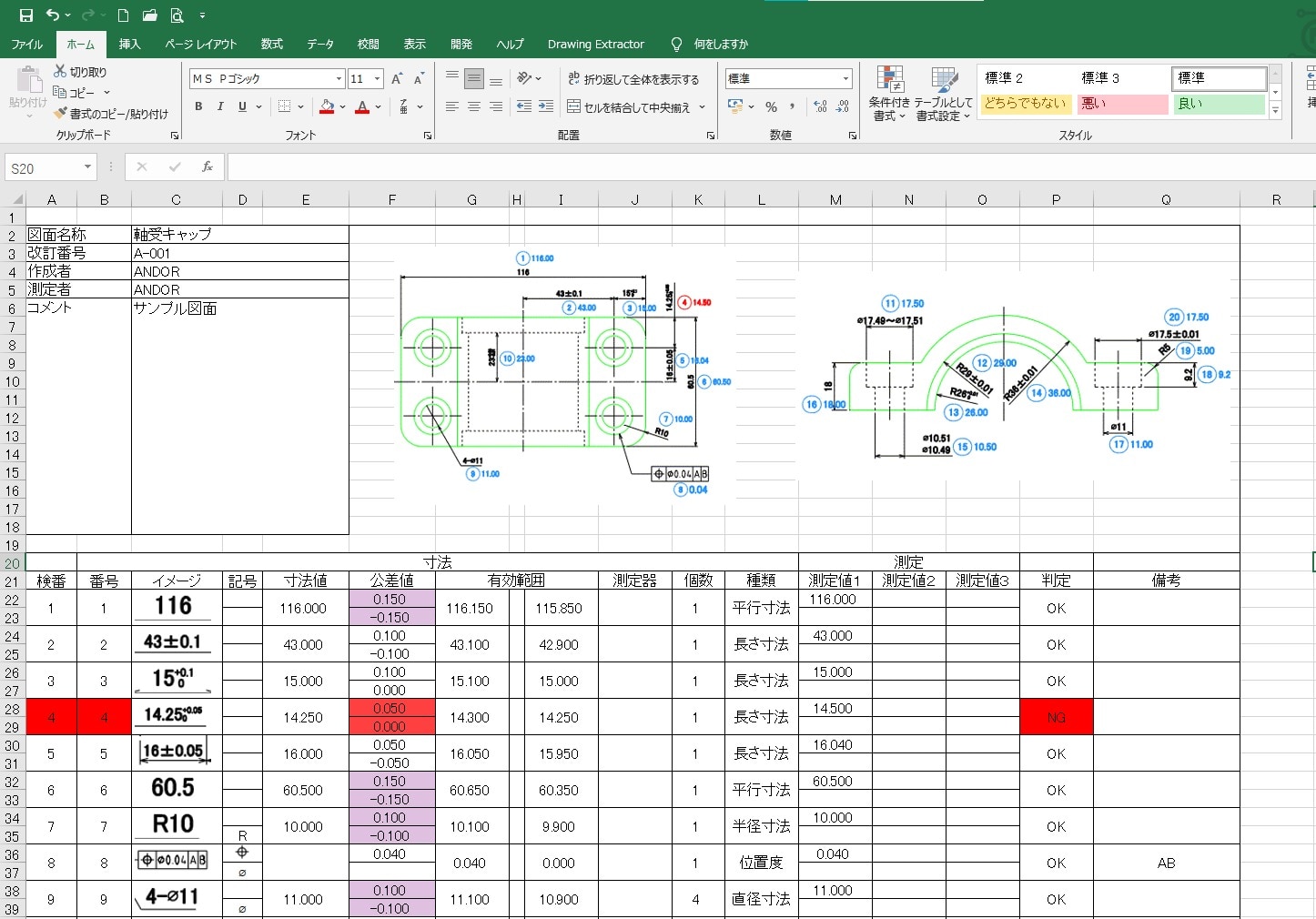 スキャンした紙図面(BMP、JPEG、TIFF等)を読み込み、ソフト上で寸法や公差を確認しながら編集・入力して検査表を作成できます。