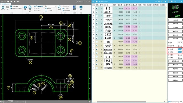 検査表と図面を照らし合わせやすいよう、図面上の各寸法箇所に対応する検査番号(バルーン)を自動で配置できます。