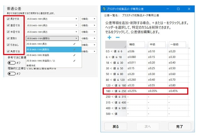 もし図面上に公差が記載されていない場合も、あらかじめ設定したJIS規格や社内規格の普通公差を自動で割り当て可能です。