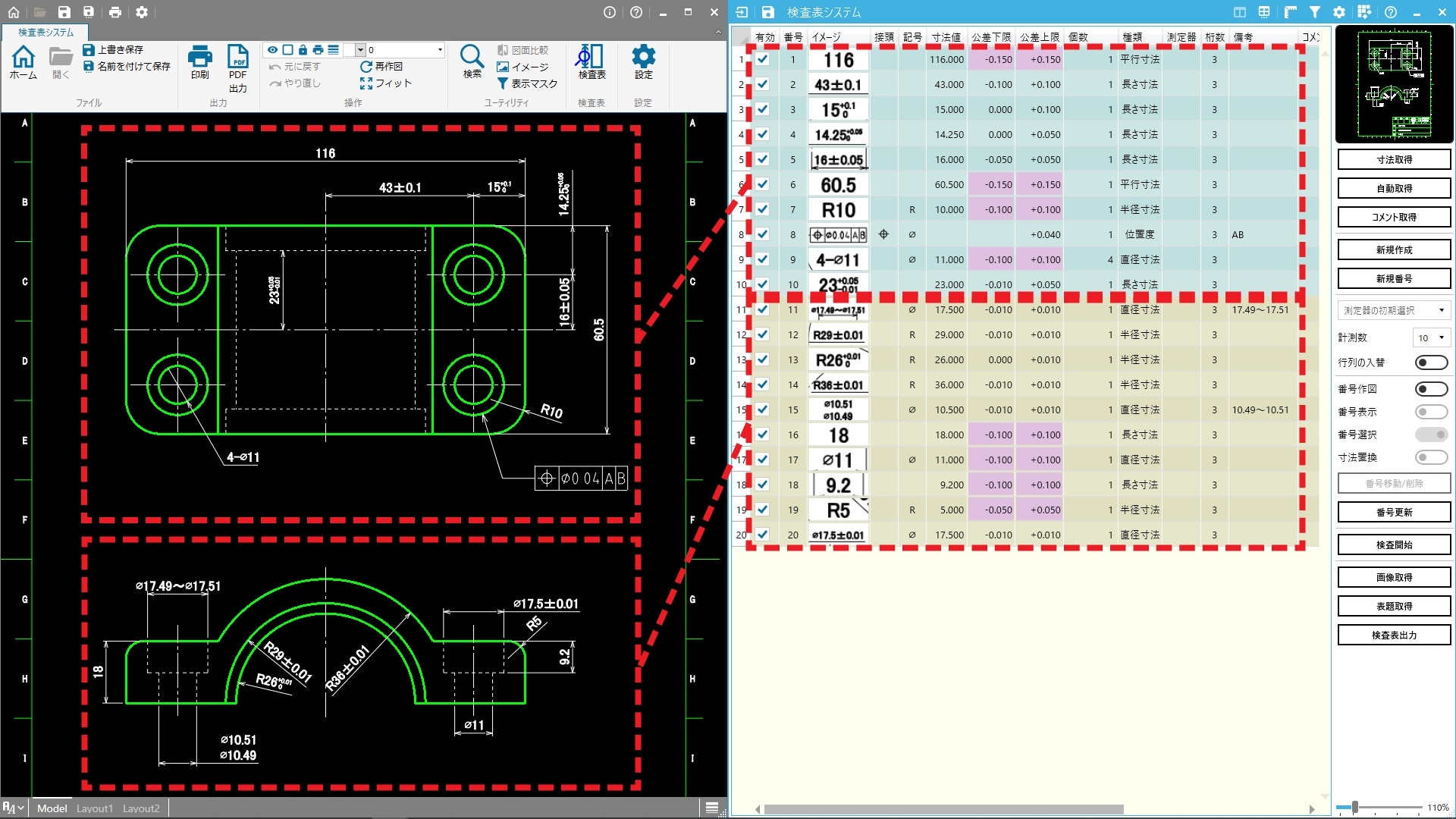 検査する範囲を指定すると、寸法と公差を自動で一覧化します。