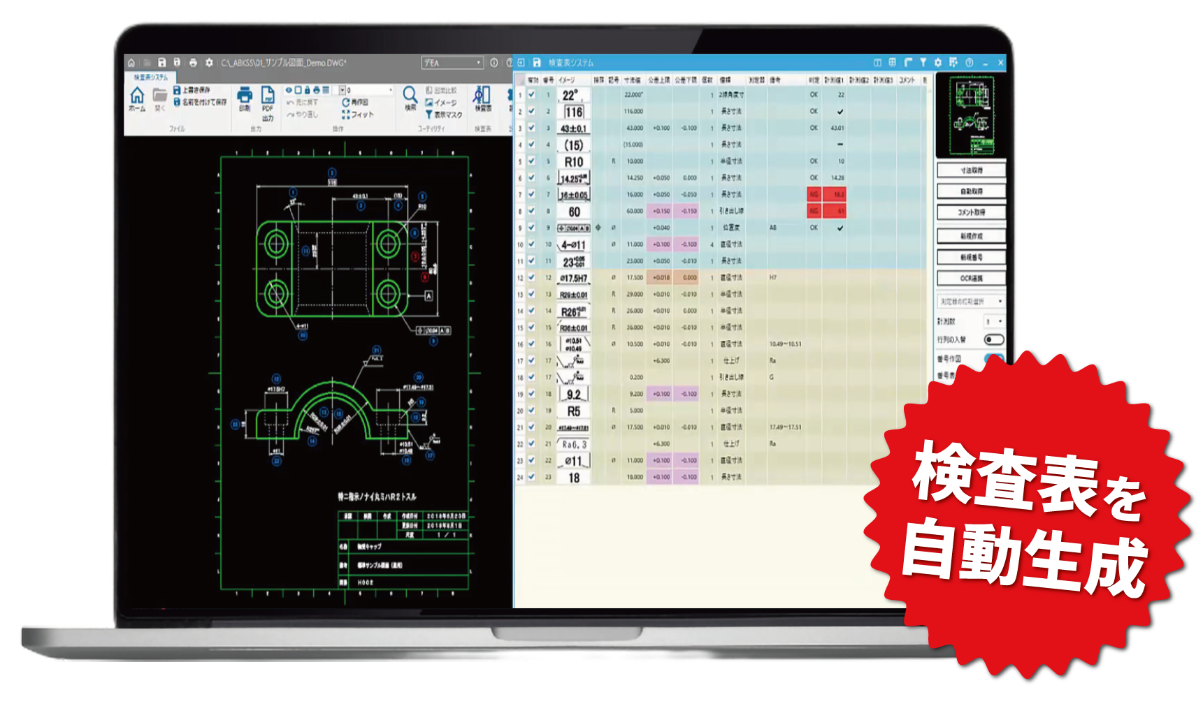「検査表システム」は、図面データから寸法・公差を自動抽出して検査表を即座に生成します。
