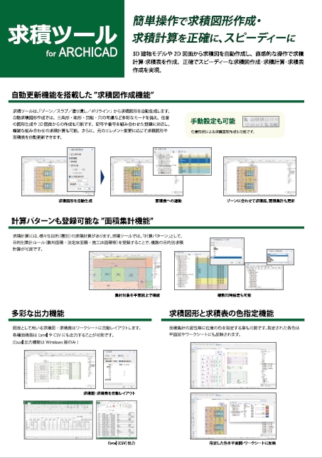 Archicad上で求積図の作成や求積計算を行うことが可能です。ゾーンやスラブなどの要素から求積図形を自動生成する求積図作成機能や、任意で登録した計算パターンをもとに自動計算する面積集計機能、求積図や面積表をExcelのワークシートに自動レイアウトする機能などにより、設計業務の中で大きなウェイトを占める求積作業の効率化に貢献します。