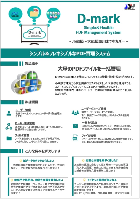 D-markは、PDFや設計関連文書をWeb上で一元管理できる文書管理システムです。文書の登録・検索・共有を一つのプラットフォームで実現し、設計図面や技術資料の管理を効率化します。