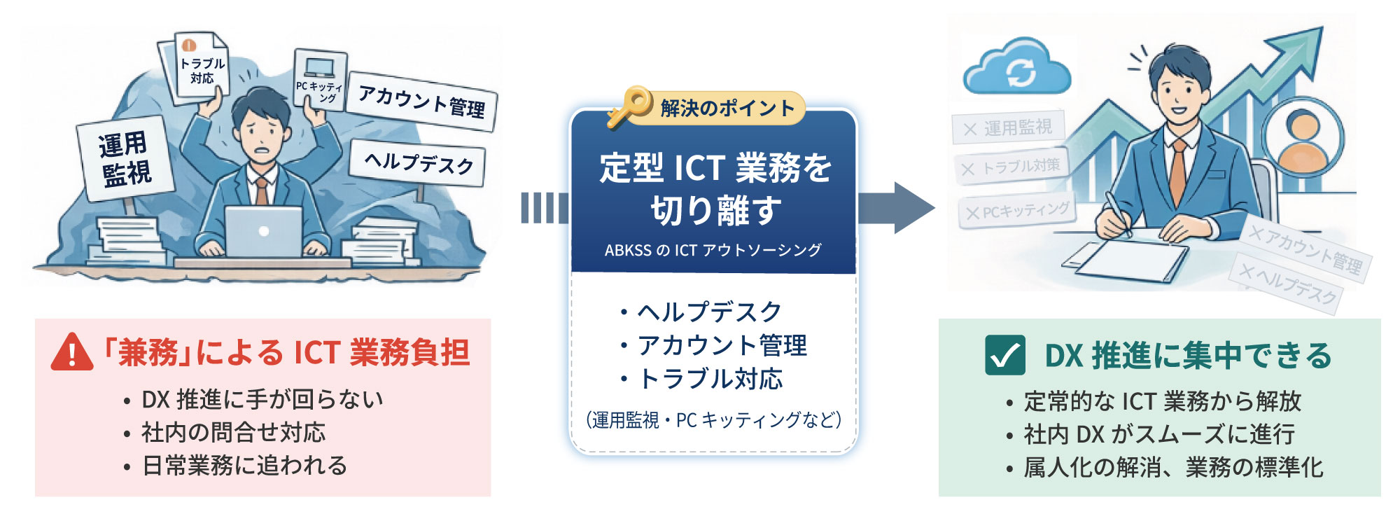 ABKSSは、DXを支える裏側のICT業務を担うことで、社内がDX推進に集中できる体制づくりを支援します。
